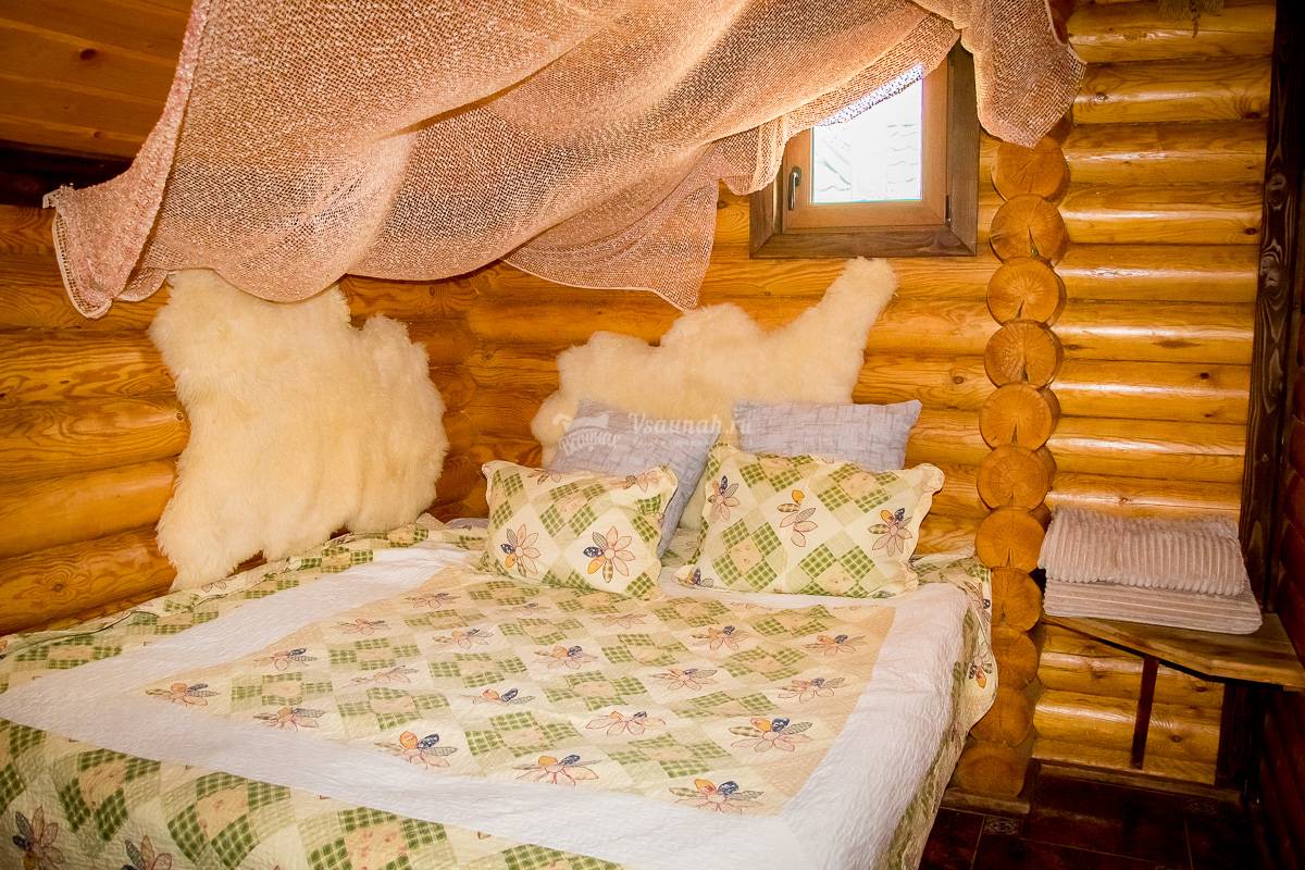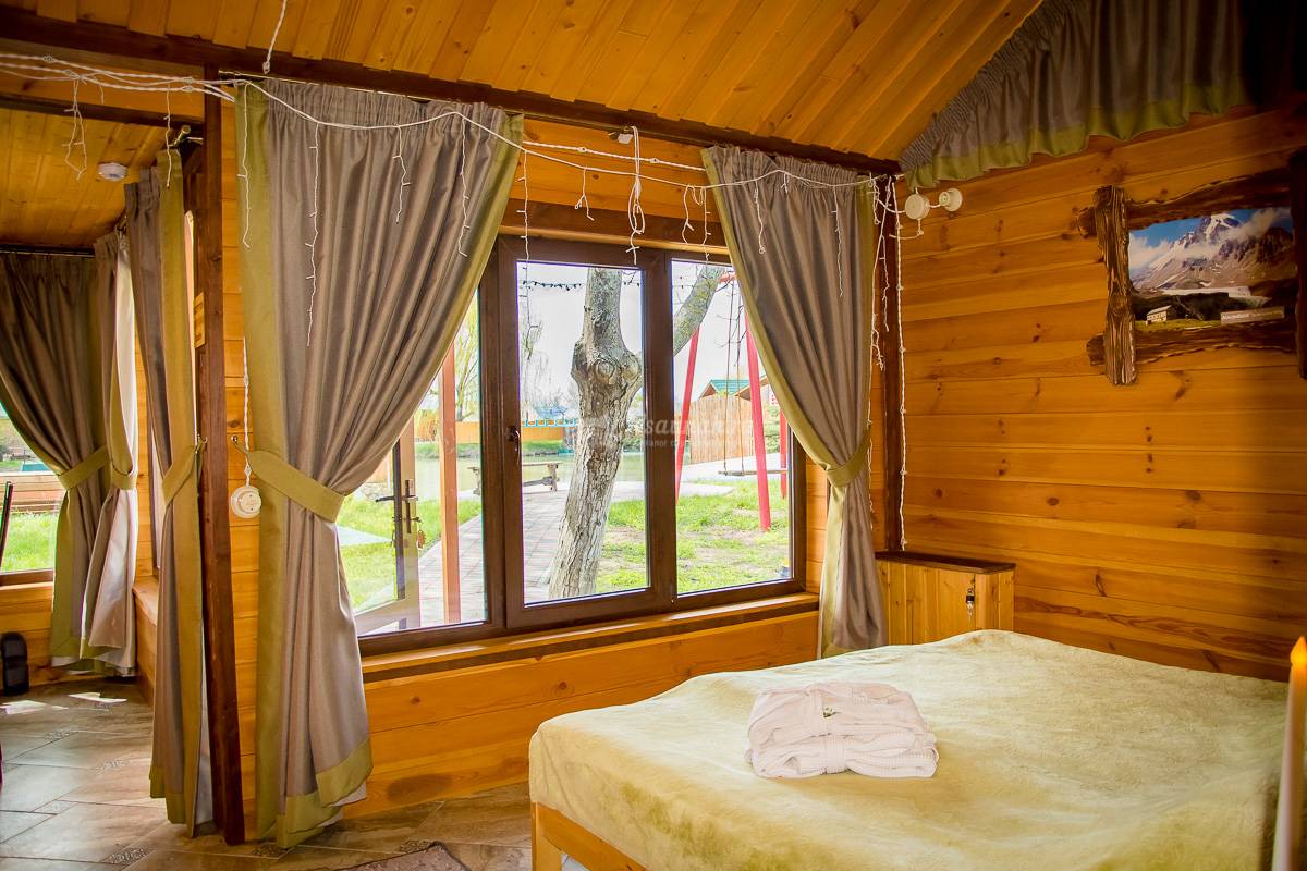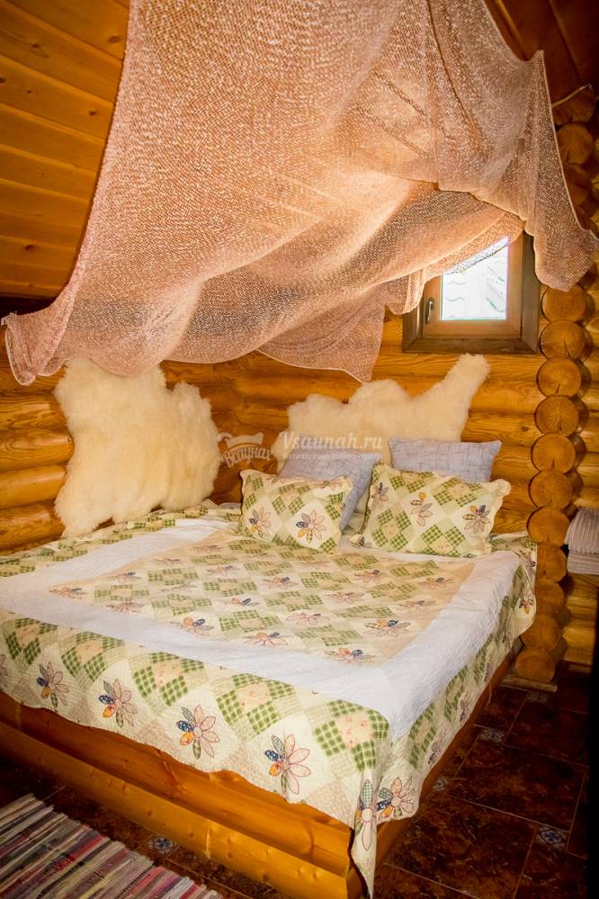 Уютная комната, отделанная деревом, с оригинальной круглой кроватью с подсветкой оборудована всем необходимым: телевизор и холодильник, большая ванна, кондиционер, электрический камин.